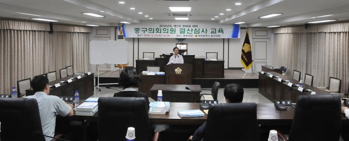 ▲ 대전중구의회는 31일 의회 본회의장에서 강사를 초빙한 가운데 의원 대상 결산심사 교육을 실시하고 있다. |