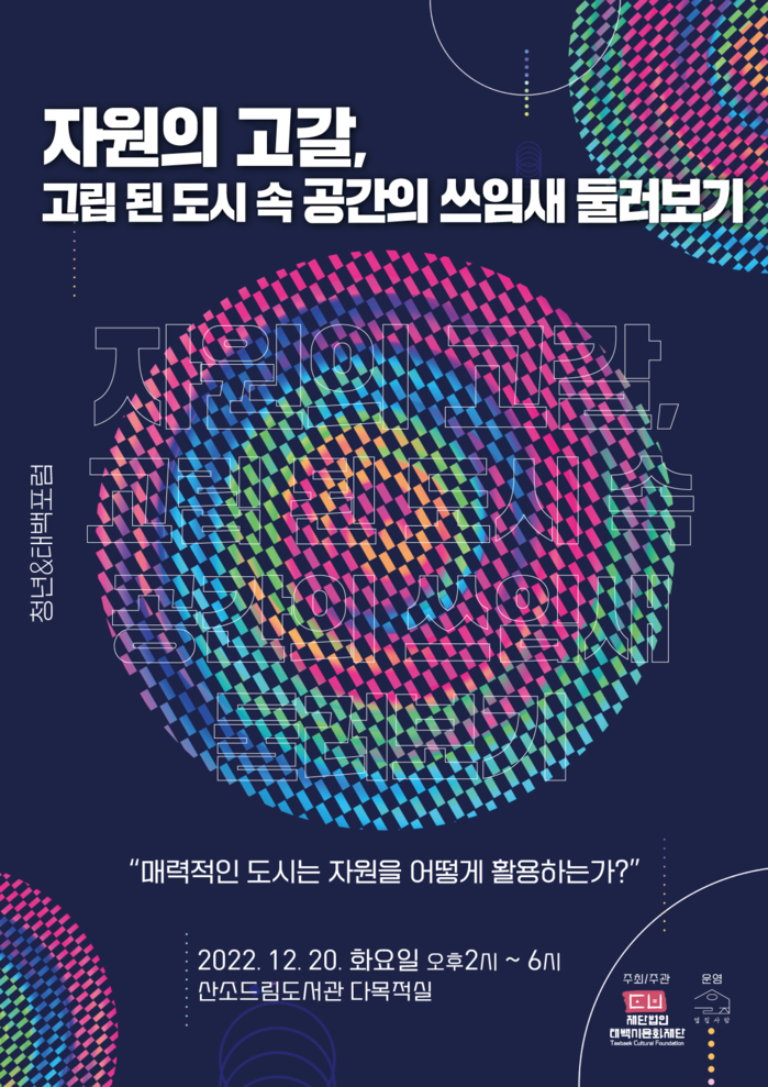 본 포럼에서는 ‘자원의 고갈, 고립된 도시 속 공간의 쓰임새 둘러보기’ 라는 주제로 도시는 어떻게 한정된 자원을 활용하여 지역을 활성화시키는지 논의한다.