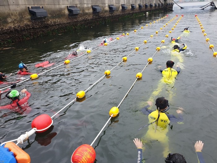 | ▲6일 창원해양경찰서 전용부두에서 해양경찰이 수중적응훈련에 임하고 있다. |