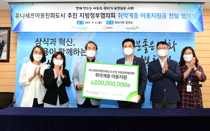 [로컬세계 고용주 기자]유니세프 아동친화도시 추진 지방정부협의회 대표 단체인 경기 화성시는 6일 초록우산 어린이재단과 ‘취약계층 아동지원을 위한 업무협약’을 체결하고 1억원의 지원금을 지정기탁 했다고 밝혔다.