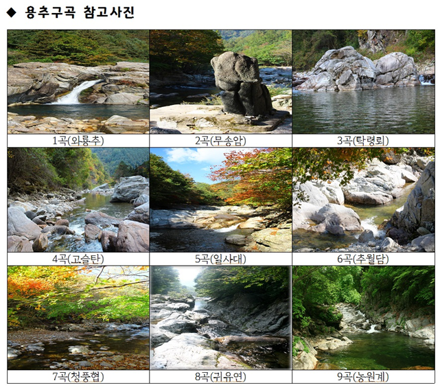 용추구곡은 1곡 와룡추(용추폭포)를 시작으로 9곡 농원계까지 약 6km 코스로 이어지는 2시간 가량의 탐방로를 따라 걸어가면, 맑은 물과 기암괴석, 짙푸른 녹음이 어우러진 풍광이 절로 감탄을 자아낸다. 특히 9곳 각 지점마다 특징이 있어 보는 재미를 더한다.