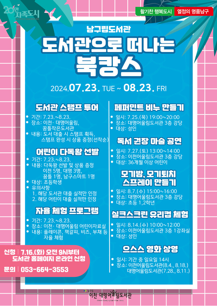 [로컬세계=박세환 기자] 대구 남구는 오는 23일부터 8월 23일까지 약 한 달간 남구립도서관에서 주민들의 무더위를 식힐 '도서관으로 떠나는 북캉스' 행사를 운영한다고 16일 밝혔다.