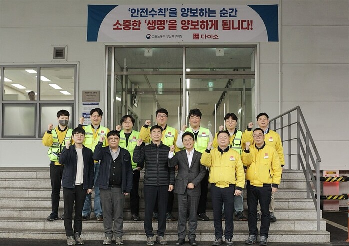 ▲지난 28일 부산 고용노동부 부산북부지청에서 안전문화 확산을 위해 ㈜아성다이소 부산허브센터와 고용노동부 부산북부지청이 업무협약(MOU)을 체결했다. (사진 왼쪽에서 세번째 신동균 ㈜아성다이소 부산허브센터장, 왼쪽에서 다섯번째 민광제 고용노동부 부산북부지청장) |