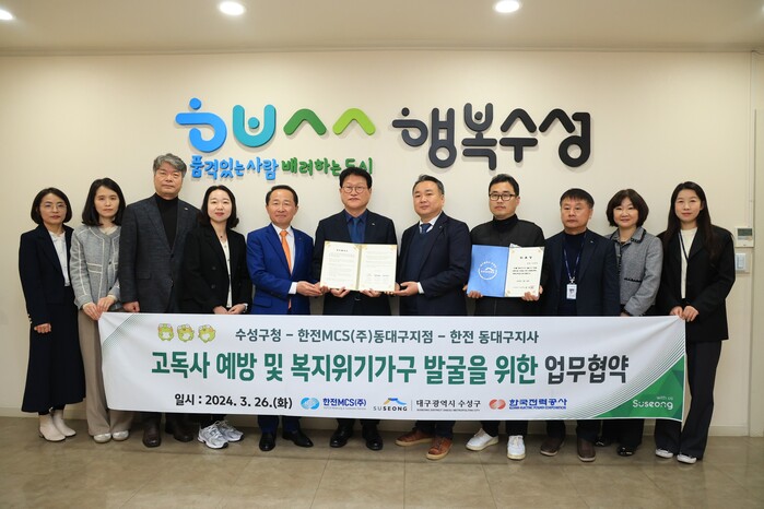 김대권 수성구청장은 “고독사 예방과 복지위기가구의 선제적 발굴을 위해서는 민관의 협력체계가 매우 중요하다”며 “이번 협약을 계기로 민관협력 위기가구 발굴 체계를 더욱 견고히 구축해 ‘고독제로-행복수성’을 만드는 데 최선을 다하겠다”고 밝혔다.