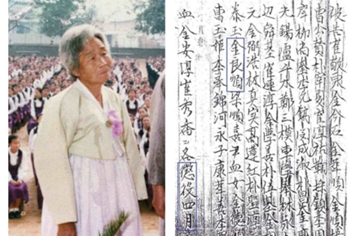 ▲ 1978년 광주수피아 여학교 독립 운동가 표창식에 참석 했던 김양순 여사와 징역 4월이 선명한 판결문 사본 |