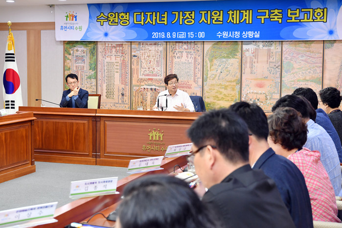 수원시는 9일 시청 상황실에서 ‘수원형 다자녀 가정 지원 체계 구축을 위한 추진상황 보고회’를 열고, 다자녀가구 지원 방안을 논의했다.