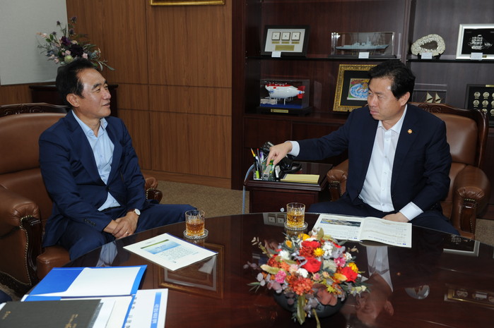 | ▲정장선 평택시장(왼쪽)이 지난 6일 김영춘 해양수산부 장관(오른쪽)과 평택항 활성화 방안을 논의하고 있다.(평택시 제공) |