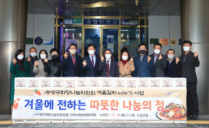김대권 수성구청장은 “코로나19로 힘든 시기인데 겨울김치를 지원해주셔서 어려운 주민들이 걱정을 덜게 됐다”며, “앞으로도 민·관 협력을 통해 따뜻한 수성구를 만들어가겠다”고 말했다.