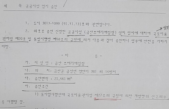 매립장 ‘입지’ 승인사항을 보면 “공공시설(금산쓰레기매립장) ‘설치 입지’에 대하여 국토이용관리법 제20조 및 동법 시행령 제58조의 규정에 의거 다음과 같이 승인하니 업무에 만전을 기하기 바람”이라고 적시돼 있다.