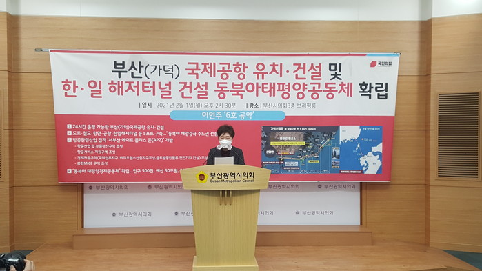 국민의힘 이언주 부산시장 예비후보는 2일 오후 2시30분 부산시의회 브리핑룸에서 기자회견을 열고 가덕도에 부산국제공항을 건설해 한일해저터널-도로-철도-항만-공항 등 ‘5-포트(PORT) 시스템’을 구축하는 한편 이 공항 건설과 연계해서 부산의 동서남북 균형발전을 꾀할 수 있는 ‘서부산권 에어로 폴리스 존(APZ)’ 개발 등을 골자로 한 6호 공약을 발표했다.