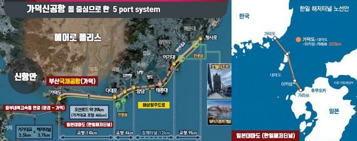 부산국제공항 건설을 통해 부산신항만, 한·일해저터널(거제~일본 쓰시마~가라쓰시), 남부내륙고속철도(거제~김천) 연결(가덕~거제, 김천~문경), 오션 로드(청사포~가덕) 등과 함께 5 포트 시스템 구축이 가능해져 부산을 글로벌 교통·물류 복합거점으로 확립하는 결정적 계기로 만들 수 있다는 것이 이 예비후보의 복안이다.