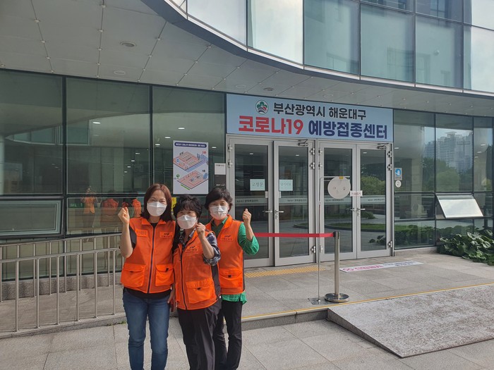 해운대소방서 의용소방대원들은 백신접종센터 화재안전성 확보 및 안정적인 백신접종을 위한 지원활동으로, 백신접종센터 순찰을 통한 화재 발생 시 초기대응과 백신접종 후 이상반응 관찰 등의 업무를 수행했다.