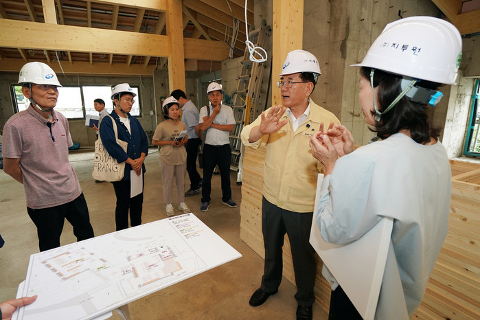[로컬세계 임종환 기자]유덕열 동대문구청장(오른쪽 두 번째)이 12일 오전, 배봉산 자락에 조성 중인 ‘배봉산숲속도서관(가칭)’ 공사현장을 찾아 진행상황을 살폈다.