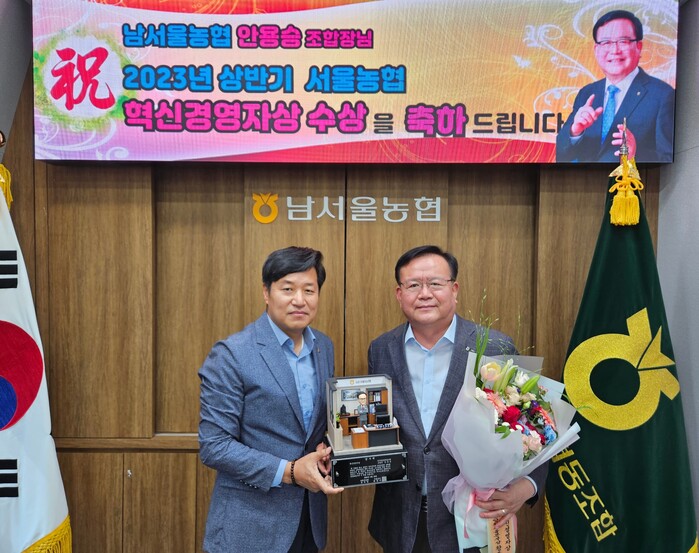 ▲ 농협중앙회 서울본부(본부장 황준구, 사진 왼쪽)는 19일, 남서울농협(조합장 안용승, 사진 오른쪽) 본점에서 '2023년 상반기 서울농협 혁신경영자상' 시상식을 개최했다. 서울농협 제공 |