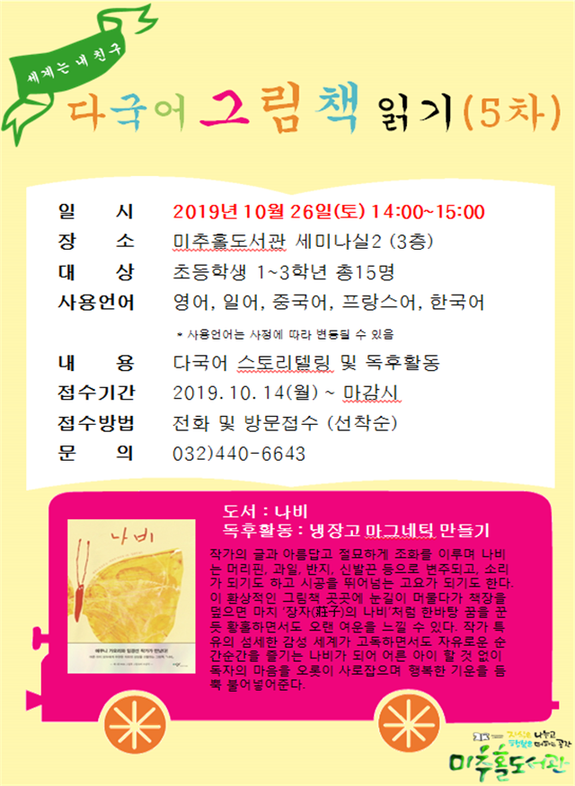 다국어그림책읽기는 어린이들에게 그림책과 함께 미추홀외고 자원봉사자가 직접 각 나라별 언어로 책 낭독 후 다양한 표현활동을 통해 주변 변화에 관심을 갖게 하고, 그림책에 대한 흥미를 유발해 평생 독서습관을 기르는데 큰 도움이 될 재미있는 책 읽기와 다양한 독후활동으로 진행한다.