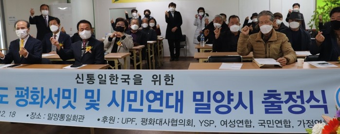 [로컬세계 밀양=정판주 기자]18일 경남 밀양시 밀양통일회관에서 신(神)통일한국 평화와 공동번영을 위한 범국민운동인 ‘한반도 평화서밋 및 밀양시 시민연대 출정식’이 열렸다.