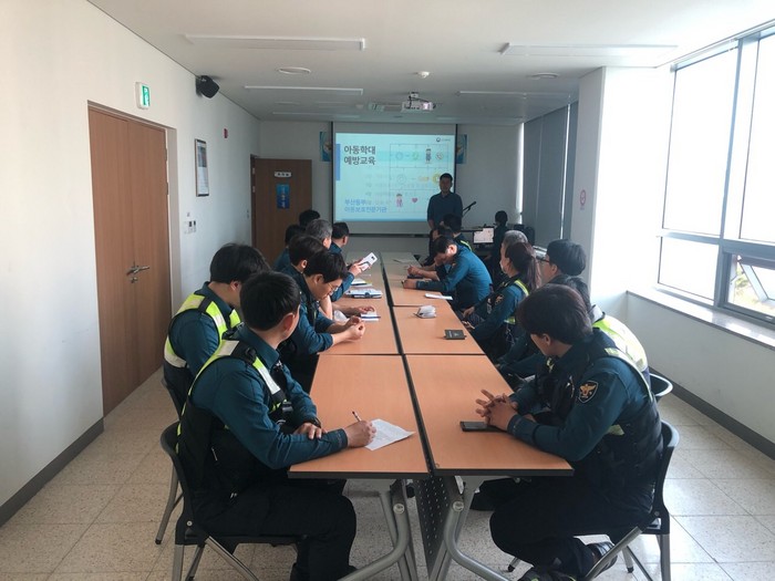 | ▲우동지구대에서 진행된 아동학대 신고처리 전문화 교육 현장 모습.(부산해운대경찰서 제공) |
