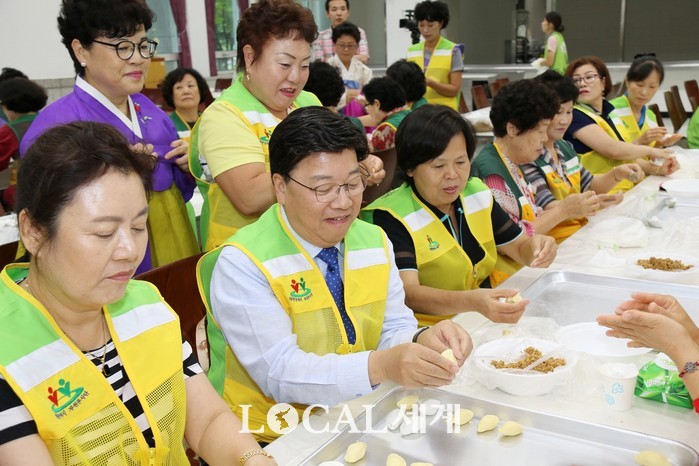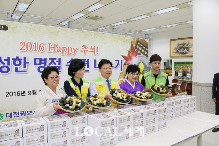 [로컬세계 오영균 기자]권선택 대전시장이 6일 시청 구내식당에서 자원봉사자 150여명과 함께 지역사회 소외계층을 위한 ‘2016 풍성한 한가위! 송편나누기’행사에서 참여했다.