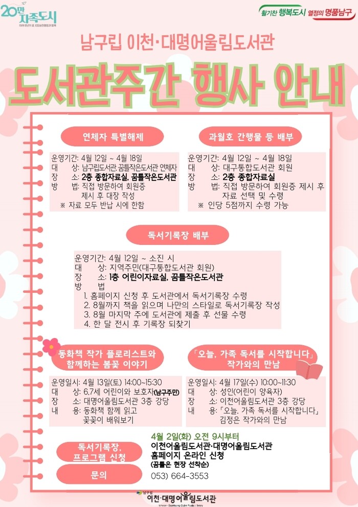 도서관 주간 동안 남구립도서관은 ▲4월 13일 동화책 작가 겸 플로리스트와 함께하는 봄꽃 이야기 ▲4월 17일「오늘, 가족 독서를 시작합니다」김정은 작가와의 만남 ▲4월 12일부터 18일까지 연체자 특별해제, 과월호 간행물 배부, 독서기록장 배부 등을 운영한다.