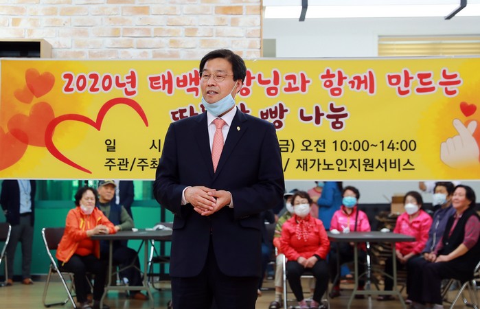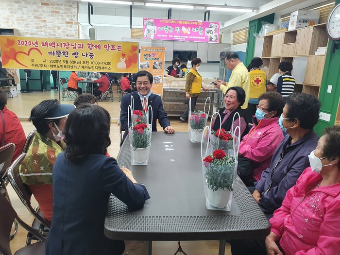 [로컬세계 박상진 기자]류태호 태백시장이 어버이날 맞아 8일 통리주민자치센터에서 열린 ‘따뜻한 사랑의 빵 나눔’ 현장을 찾아 봉사자들을 격려했다.