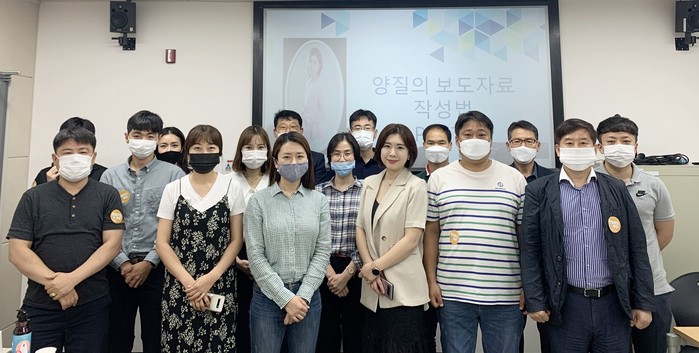 | ▲남해지방해양경찰청 소속 경찰관들이 18일 오전 부산시청자미디어센터에서 보도자료 작성법 강의를 마치고 기념촬영 하고 있다 |