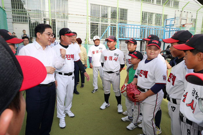 | ▲허성무 시장이 9일 진해구 풍호공원 운동장에서 진해리틀야구단 감사용 감독 및 선수들 등을 만나 애로사항을 청취했다. |