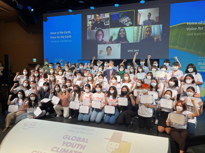 | ▲글로벌에코리더 참여 학생들이 ‘2021 피포지(P4G) 서울 녹색미래 정상회의’ 공식 사전행사에서 기념 사진을 찍고있다 |