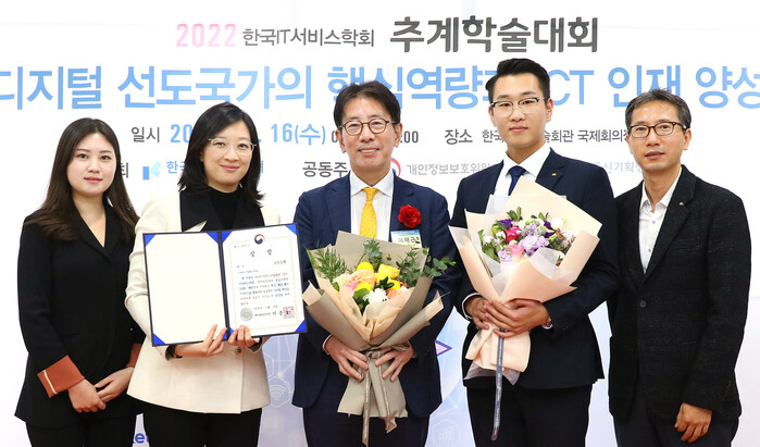 | ▲16일 한국과학기술회관에서 열린 '2022 한국IT서비스학회 추계학술대회'에서 (왼쪽)박윤규 과학기술정보통신부 제2차관과 (오른쪽)이재근 KB국민은행장이 기념촬영을 하고 있다. |