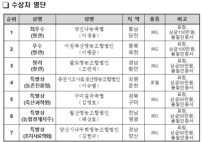 시상식을 주관한 김명국 농협경제지주 친환경방역국장은 “본 대회를 통해 국내 조사료 품질향상과 생산량 증대가 이루어지기를 기대한다”며 “농협은 앞으로 조사료 산업육성과 농가의 적극적인 관심과 참여를 위해 더욱 노력하겠다”고 말했다.