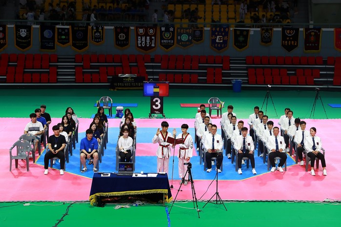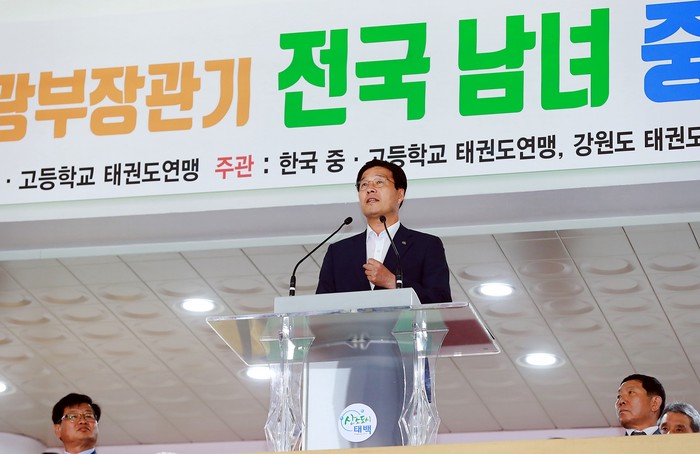 류태호 태백시장이 1일 고원체육관에서 관계자 등 3200여 명이 참석한 가운데 제30회 문화체육관광부장관기 전국 남·녀 중·고태권도대회 개회식에서 인사말을 하고 있다.(사진=태백시 제공)