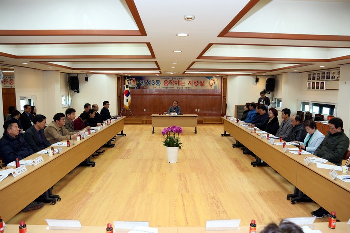27일 안성3동 주민센터 3층 대회의실에서 열린 ‘움직이는 시장실’은 3동 기관단체장과 마을주민 등 30여명이 참석한 가운데 지역 현안사항에 대한 토론, 상담 민원실 운영, 복지사각지대 현장방문 등으로 진행됐다. 이는 안성1동에 이어 두 번째이다.