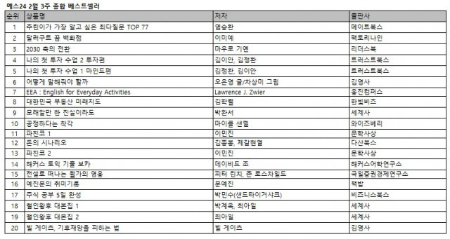 예스24 2월 3주 종합 베스트셀러에서는 주식 전문가 ‘염블리’ 염승환의 주린이를 위한 참고서 ‘주린이가 가장 알고 싶은 최다질문 TOP 77’이 1위에 올랐다.
