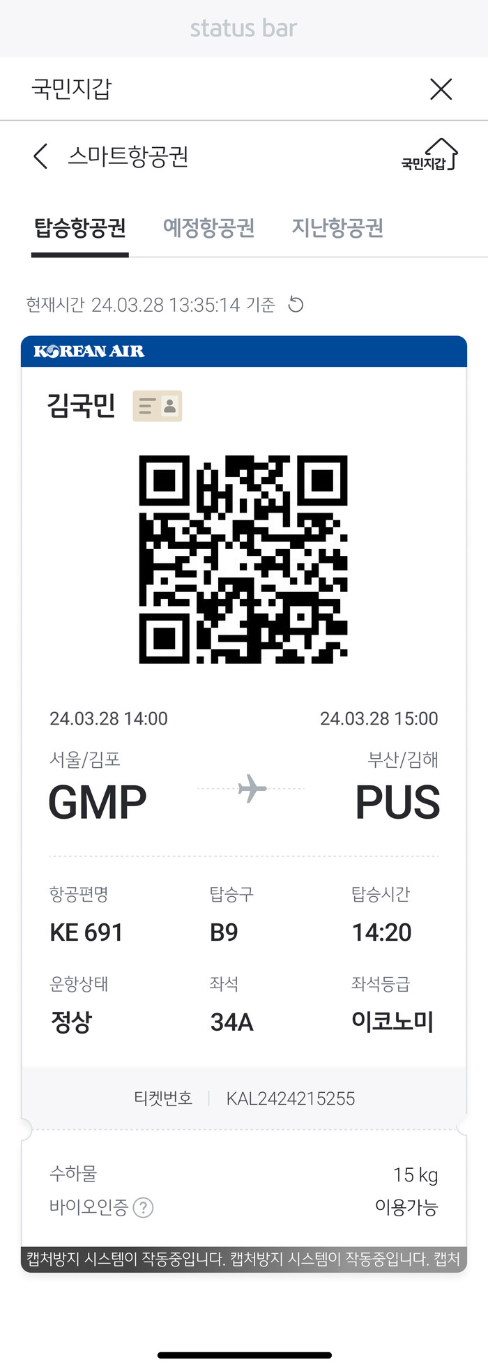 [로컬세계 = 마나미 기자] KB국민은행(은행장 이재근)이 한국공항공사와 협업해 전국 14개 공항에서 국내선 탑승 시 신분증과 탑승권 정보를 한 번에 보여주는 ‘스마트 항공권’ 서비스를 시행한다.