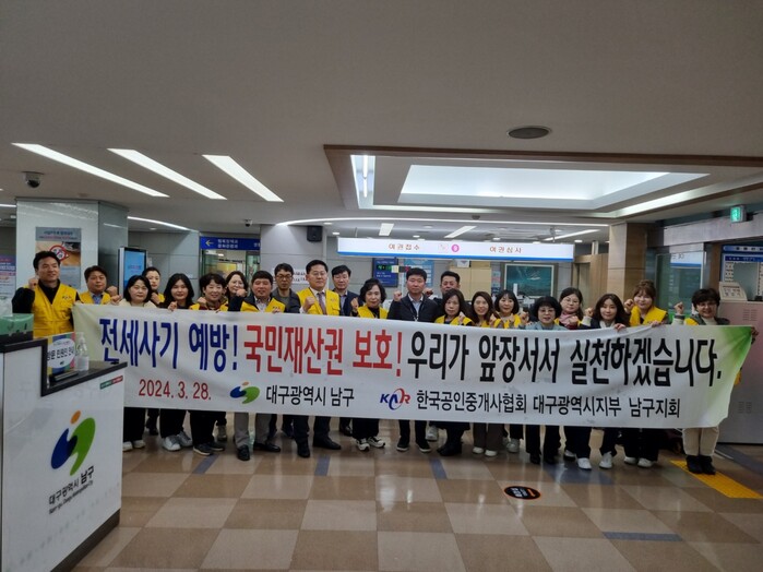 [로컬세계=박세환 기자] 대구 남구은 지난달 28일 한국공인중개사협회 대구지부 및 남구지회와 관내 공인중개사사무소를 방문해 전세사기 예방 캠페인을 펼쳤다.