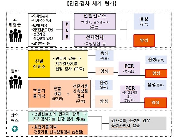 이외 일반 국민이 선별진료소에 갈 경우 관리자 감독 하에 자가검사키트로 신속항원검사를 무료로 실시하고 양성인 경우에 PCR 검사를 받을 수 있다.