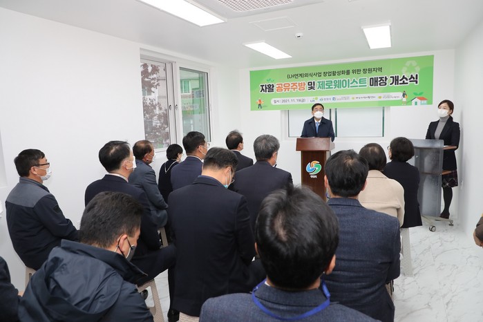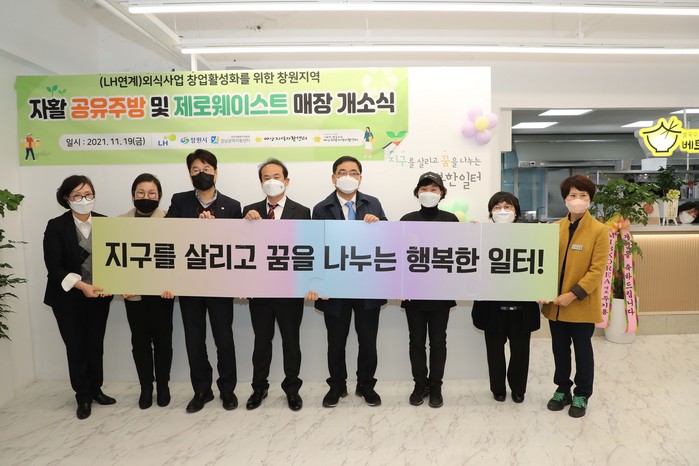 [로컬세계 권인진 기자]경남 창원시는 19일 오후 4시 40분 마산회원구 내서읍 상곡영구임대상가(2층·257㎡)에서 한국토지주택공사(LH) 공실을 활용한 공유주방 및 제로웨이스트 자활사업장 개소식을 개최했다.