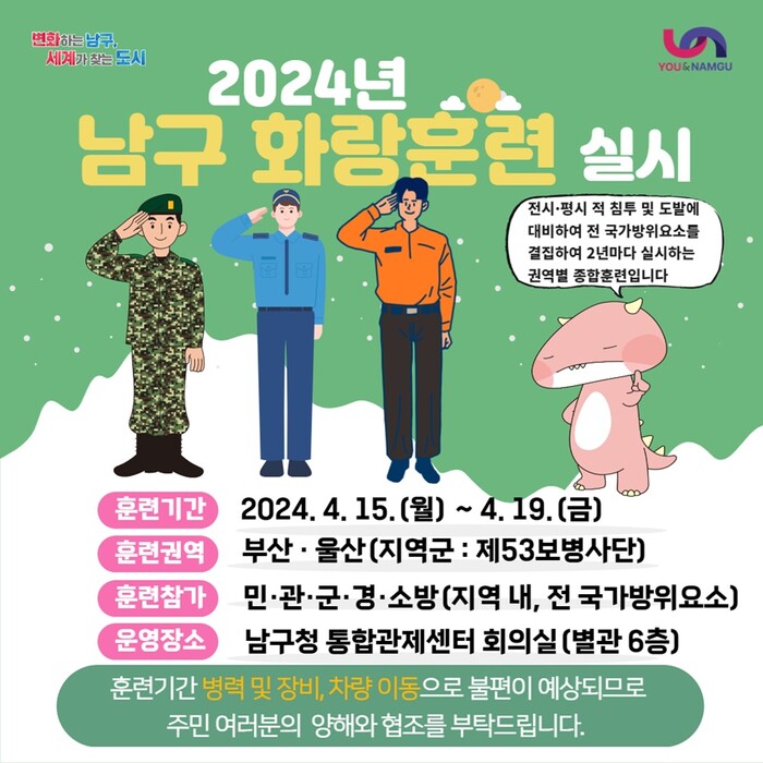 부산 남구는 통합방위지원본부 통제 아래 제6339부대 1대대, 남부소방서, 남부경찰서 등 지역 내 전 국가방위기관들과 함께 통합방위 작전계획의 시행 절차 숙달과 상황 대응능력 강화에 중점을 두고 화랑훈련을 지원할 예정이다.