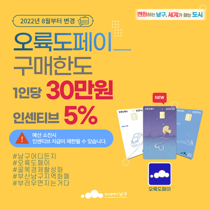 [로컬세계 부산=맹화찬 기자]부산 남구는 다음 달 1일부터 ‘오륙도페이’ 발행정책을 구매한도 40만원, 10% 인센티브 지급에서 “구매한도 30만원, 인센티브 5% 지급”으로 하향 조정한다고 28일 밝혔다.