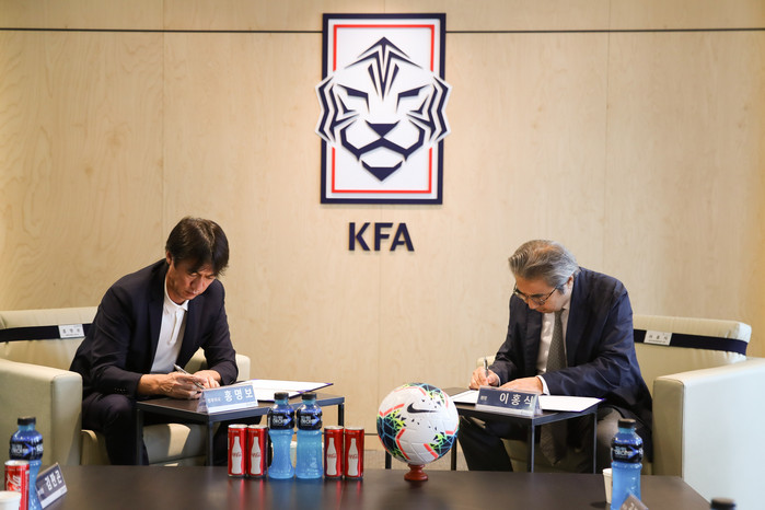 ▲이홍식 한국도박문제관리센터 원장(오른쪽)과 홍명보 대한축구협회 전무이사(왼쪽)가 축구계 내 승부조작 및 불법도박 예방을 위해 12일 대한축구협회 접견실에서 업무협약을 체결했다./(사진제공=한국도박문제관리센터) |