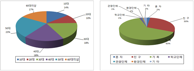 | ▲분석결과 방문 연령층은 다양하나 30~50대가 많고, 가족과 함께(63%) 찾는 것으로 나타남. |