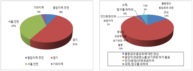 | ▲방문자 대부분(96%)이 수도권 주민이며, 여가활용(75%)을 목적으로 방문. |