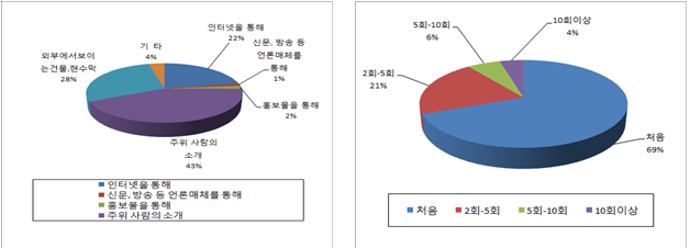| ▲방문은 주위 사람 소개(43%) 건물을 보고(29%) 순이며, 첫 방문 69%, 2회 이상 방문 31%로 나타남. |