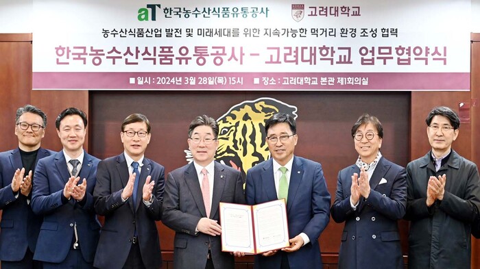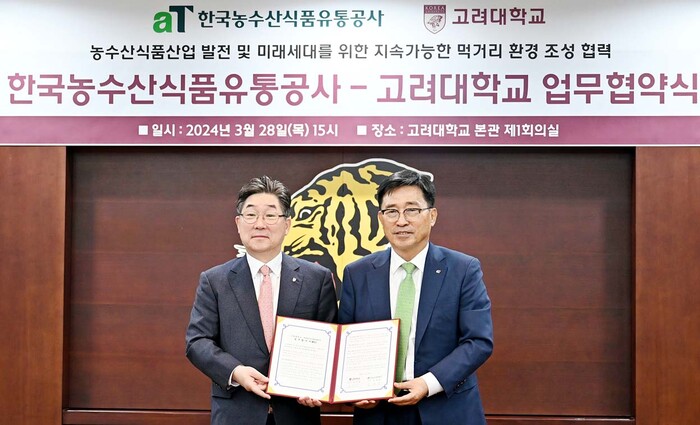 한국농수산식품유통공사(사장 김춘진)와 고려대학교(총장 김동원)는 28일 고려대학교 안암캠퍼스에서 지속 가능한 먹거리 환경 조성과 농수산식품 산업 발전을 위한 업무협약을 체결했다.