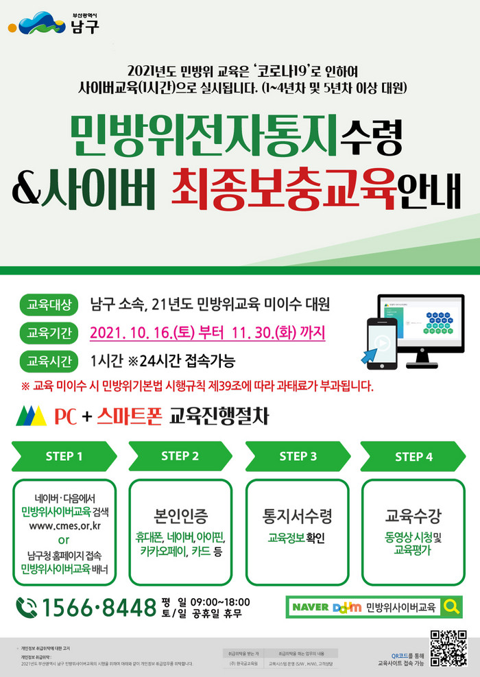[로컬세계 맹화찬 기자]부산 남구(구청장 박재범)는 하반기 민방위 1차 보충교육 미 이수자 1700여 명을 대상으로 오는 16일부터 11월 30일까지 2차 보충교육을 실시한다고 6일 밝혔다.