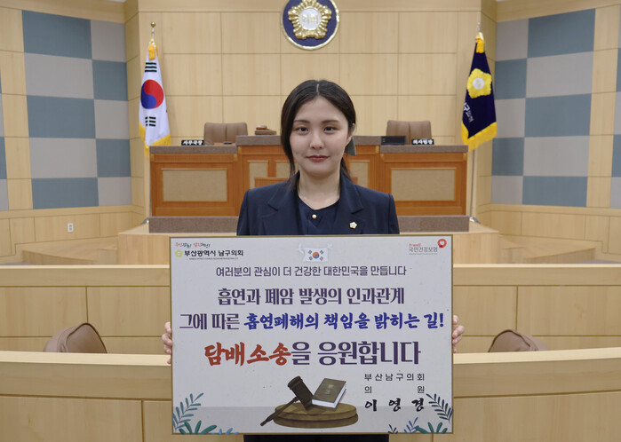 ▲부산 남구의회 이영경 의원 담배소송 응원 릴레이 챌린지 동참했다. 남구의회 제공 |