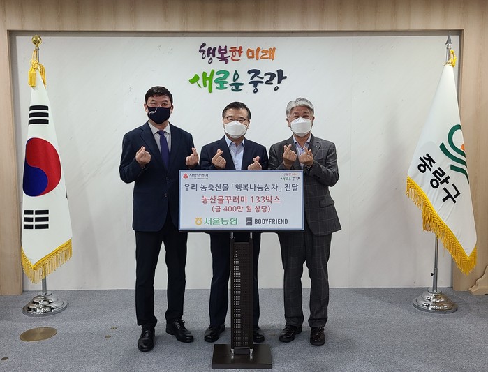▲1일 서울농협과 ㈜바디프랜드는 서울 중랑구청에 '우리 농축산물 행복나눔상자'133박스를 전달했다. 왼쪽부터 ㈜바디프랜드 이동환 부사장, 중랑구청 류경기 구청장, 농협서울지역본부 이대엽 본부장. 서울농협 제공 |