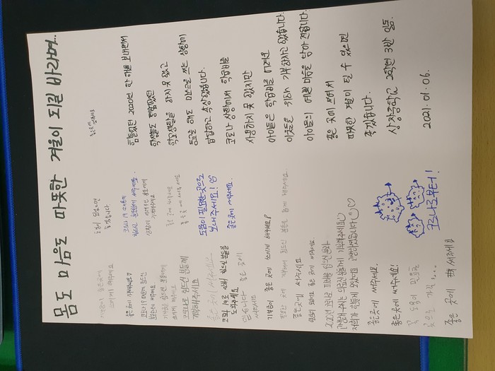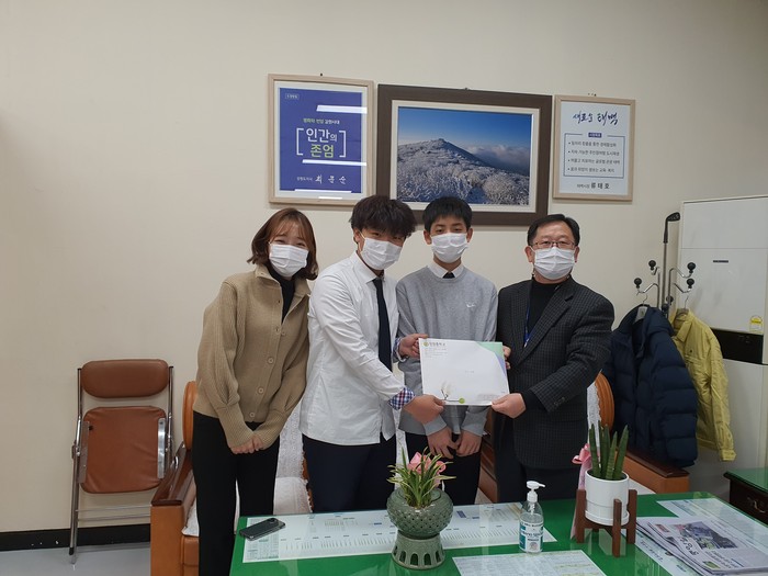 하초연 선생님은 “2-3반 학생들이 자발적으로 코로나 19로 어려움을 겪는 분들에게 조금이라도 나눔을 실천했으면 좋겠다면서 학생들 스스로 자신들의 용돈을 모아서 성금을 마련했으며, 학생들의 메시지도 전해주고 싶어서 함께 방문하게 됐다”고 전했다.
