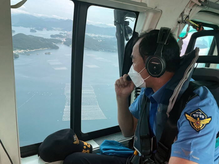 [로컬세계 부산=맹화찬 기자]윤병두 남해지방해양경찰청장이 태풍 '힌남노'가 북상함에 따라 4일 오후 부산항공대 헬기를 이용해 거제, 통영연안 일대 해양시설물과 고현만 피항지, 진해만 피항지, 부산신항 등을 항공 순찰했다.