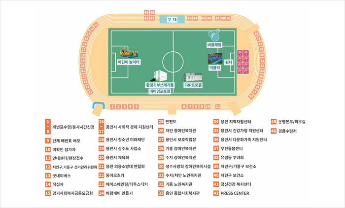 이밖에 용인시의 사회복지시설과 사회적기업, 보건소 등 40여 개의 홍보부스와 각종 체험부스, 에어바운스 놀이터도 설치해 시민들에게 다양한 즐길거리를 선사한다.