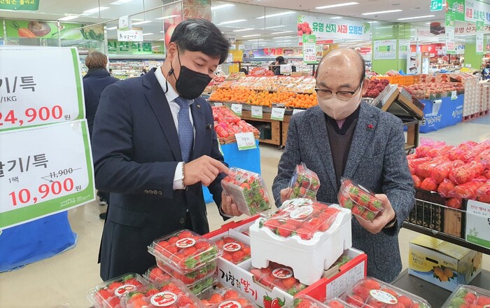 ▲ 황준구 농협중앙회 서울본부장(왼쪽)이 2일 관악농협 농산물백화점을 찾아 박준식 관악농협 조합장(오른쪽)과 함께 진열된 과일을 살펴보고 있다. |
